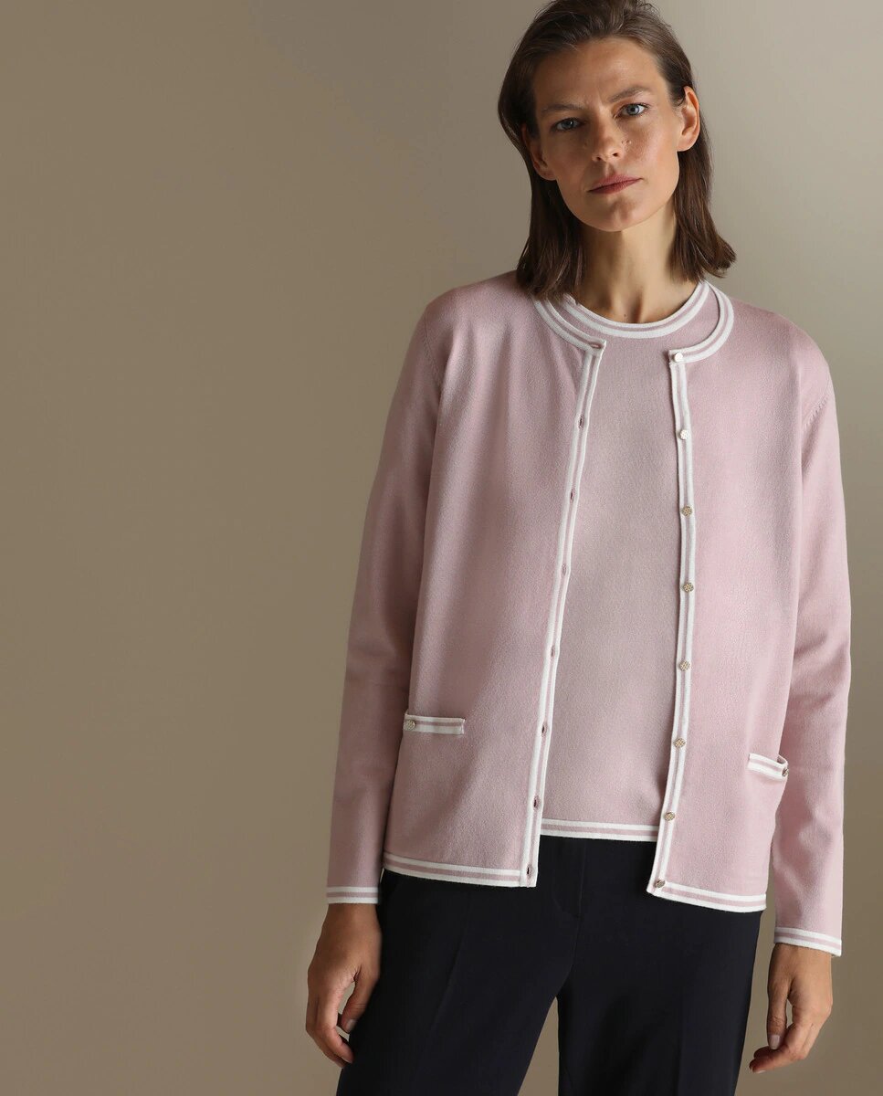La siguiente prenda rebajada de El Corte Inglés es este twin set de mujer con vivo a contraste. Está formada por una chaqueta y un top con vivo a contraste. La chaqueta es de manga larga, con cierre de botones y dos bolsillos. En cuanto al top, es a juego, tiene manga corta y tiene el cuello caja. En ambos casos, tienen estampado liso y tiene una composición 70% viscosa y 30% nylon.
