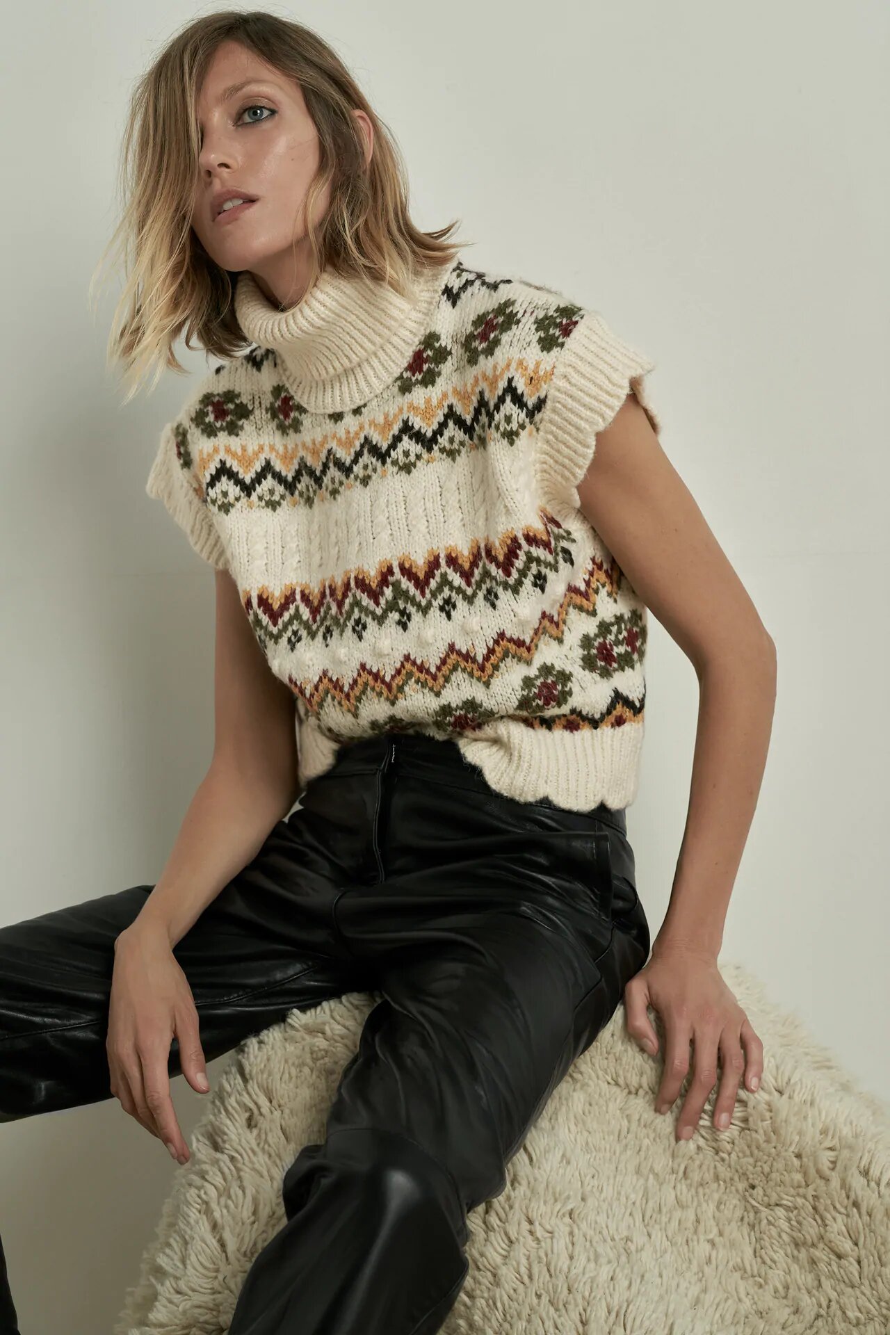 La prenda tiene el cuello subido y manga sisa con detalle de volante en estas y en el bajo. El tejido tiene además detalle de ochos. El precio del jersey es de 22,95 euros, y este es el enlace en el que puedes encontrarlo.