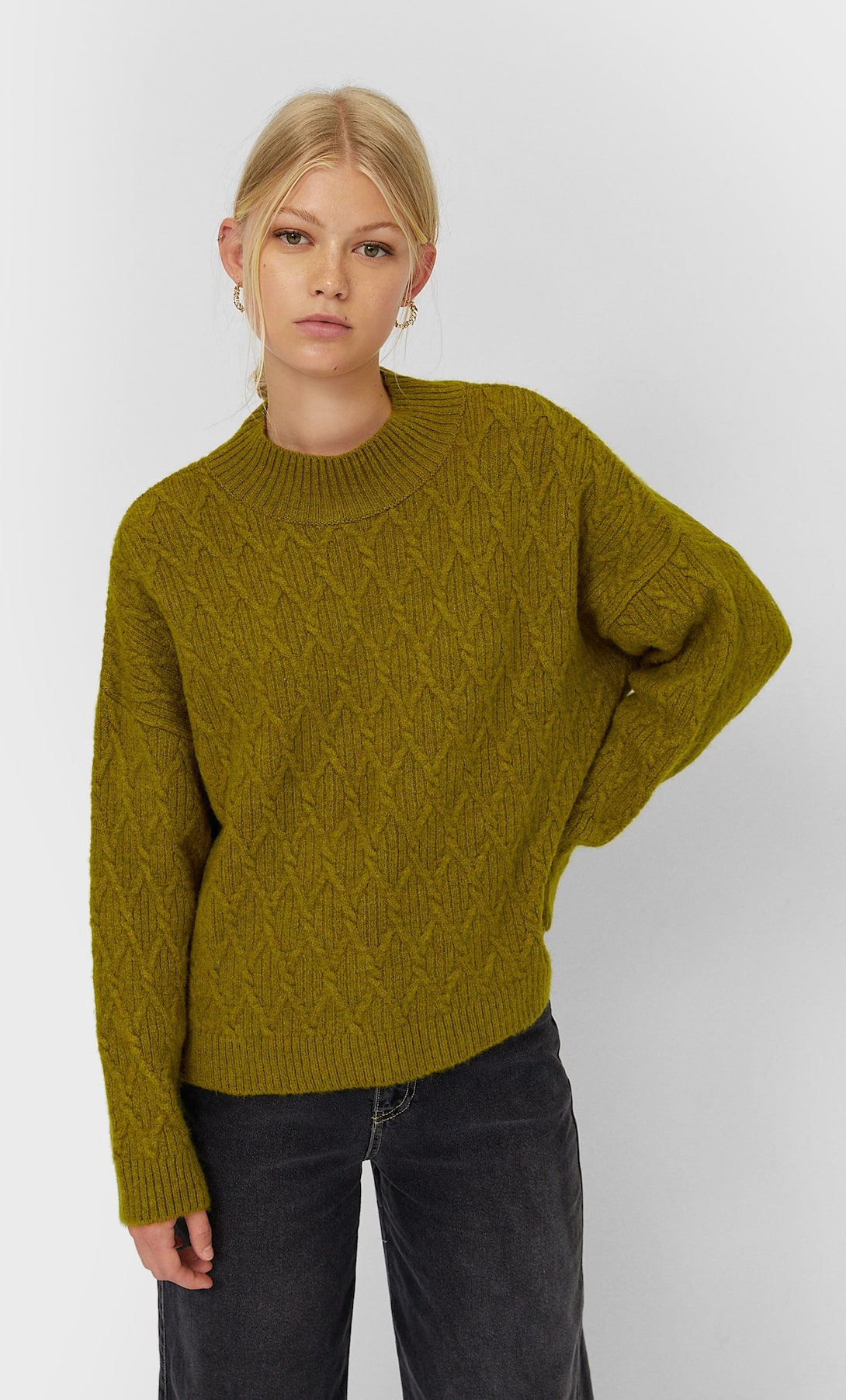 Llevamos varias temporadas viendo el cuello perkins en muchos jerséis, sweaters y tops. Es un diseño con varias ventajas. Por una parte es un extra de abrigo, sin llegar a ser un cuello alto, o un cuello vuelto, que puede resultar agobiante a algunas personas. Por la otra, le da un punto de elegancia sobria a la prenda. Recibe su nombre del actor Anthony Perkins, que vistió un jersey con este tipo de cuello durante su interpretación de Norman Bates en la película ‘Psicosis’. La versión de Stradivarius es de punto con un detalle trenzado en forma de rombos, lo que le da un toque muy rústico e invernal. Está fabricado en 7% acrílico, 16% poliéster, 7% poliamida y se encuentra disponible en colores verde, crudo, beige y gris mezcla. La rebaja en este caso es del 50% y el precio final se queda en 12, 99 €.
