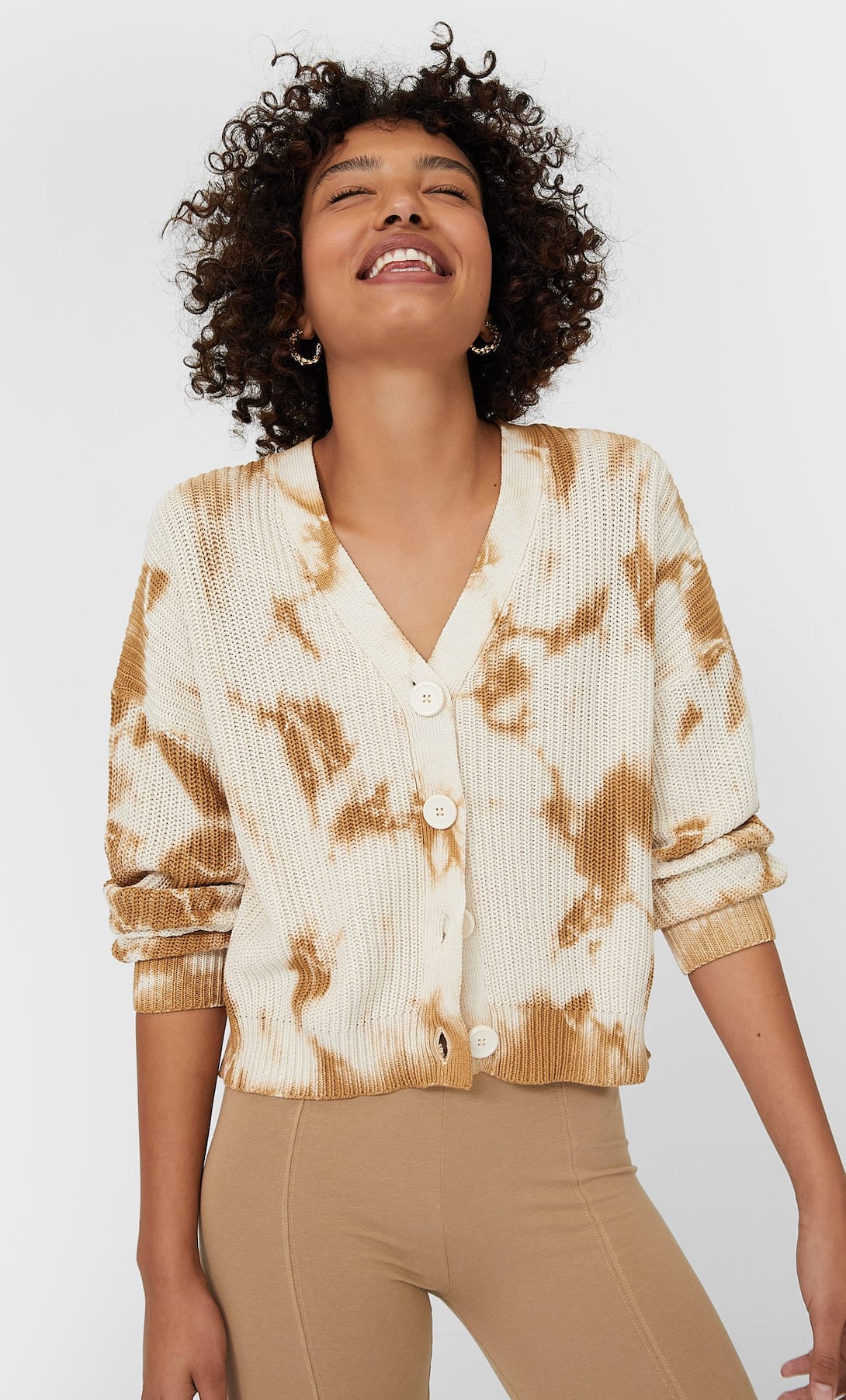 El estampado tie dye está invariablemente asociado con el verano, con la época de playa y festivales y con un estilo puramente hippy y desenfadado. Pero de un tiempo a esta parte es cada vez más frecuente ver este estilo en otro tipo de prendas, propias de tiempos más fríos, como jersey o sudaderas. Ahora en Stradivarius hemos encontrado un original cárdigan en tonos blanco y vainilla con un efecto tie dye muy alegre y juvenil. El diseño de la chaqueta es básico, hecha de punto grueso de algodón, con un escote de pico, manga larga y botones delanteros, que si se abrochan, permiten usar la prenda a modo de jersey. Al igual que todas las prendas de la tienda, está disponible en los establecimientos físicos como en su espacio online. El precio es 12,99 €.