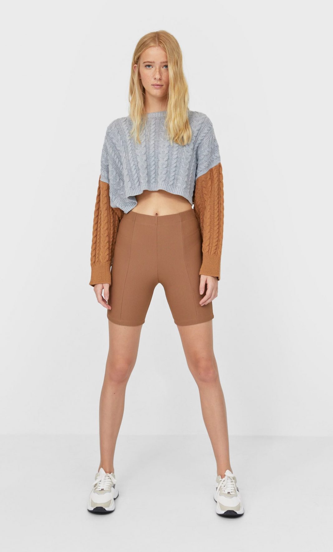 Volviendo al estilo crop top, podemos encontrar modelos más arriesgados, que tal vez no son muy adecuados para salir a la calle en invierno, pero pueden utilizarse para diferentes combinaciones a capas, y jugar así a conseguir resultados creativos y originales. Este que te mostramos es de punto trenzado, tan clásico como de inspiración invernal, pero modernizado con el estilo cropped de esta temporada. Es de manga larga y cuello redondo y lo puedes conseguir en dos versiones muy llamativas: en color verde pistacho o en gris, con mangas en contraste en tono beige. Tiene una rebaja del 35% y ahora cuesta 12,99 €.