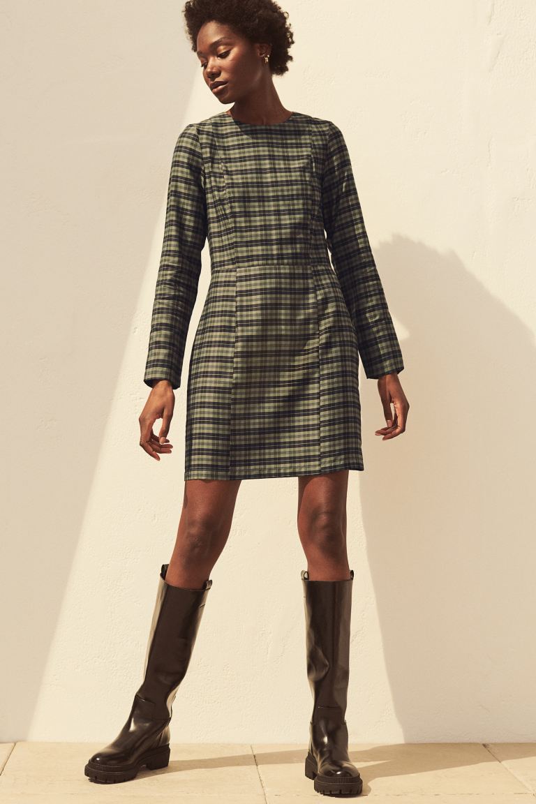 Como siempre os decimos, los complementos son de vital importancia, aunque este diseño te viste él solo. Se trata de un vestido con estampado a cuadros de color verde caqui oscuro.