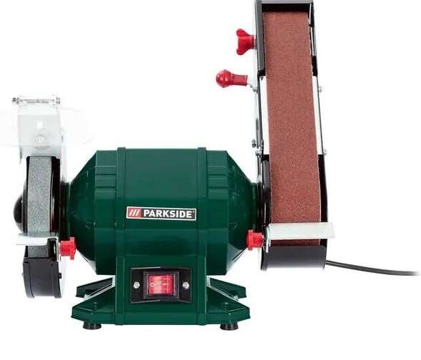 El siguiente producto es esta lijadora de banda fija. Es un aparato ideal para trabajar madera, plástico y metal, teniendo soportes ajustables a la pieza de trabajo. Eso hace que sirva para quitar óxido, lijar y desbarbar.