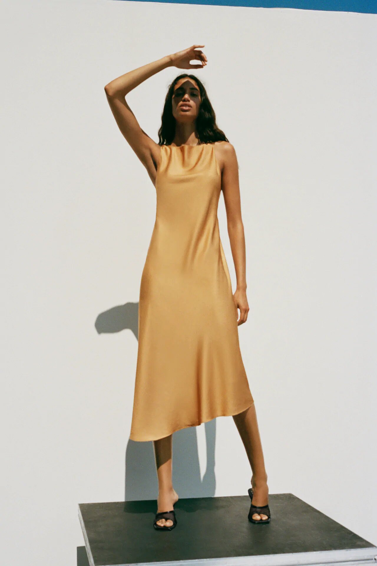 Lo siguiente que veremos es este vestido rústico de Zara de color ocre. Se trata de una prenda con cuello redondo y manga sisa. Asimismo, cuenta con un bajo asimétrico. En cuanto a sus tallas, tiene desde la XS hasta la XL disponible, incluyendo también todas las tallas intermedias.