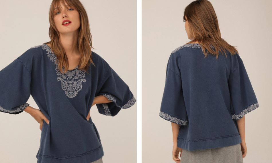 De corte del cuerpo recto, presenta remates en la parte inferior de añadidos cosidos a la inversa y con doble pespunte, para dar sensación de apliques decorativos. Cuello en pico en el delantero, y bordados vegetales en contraste. Manga semi larga (hasta el codo), caída y amplia, de estilo francés, y remate con bordados. Si te gusta este estilo de prendas y tu talla es S, M o L, por 19,99 euros puedes innovar.