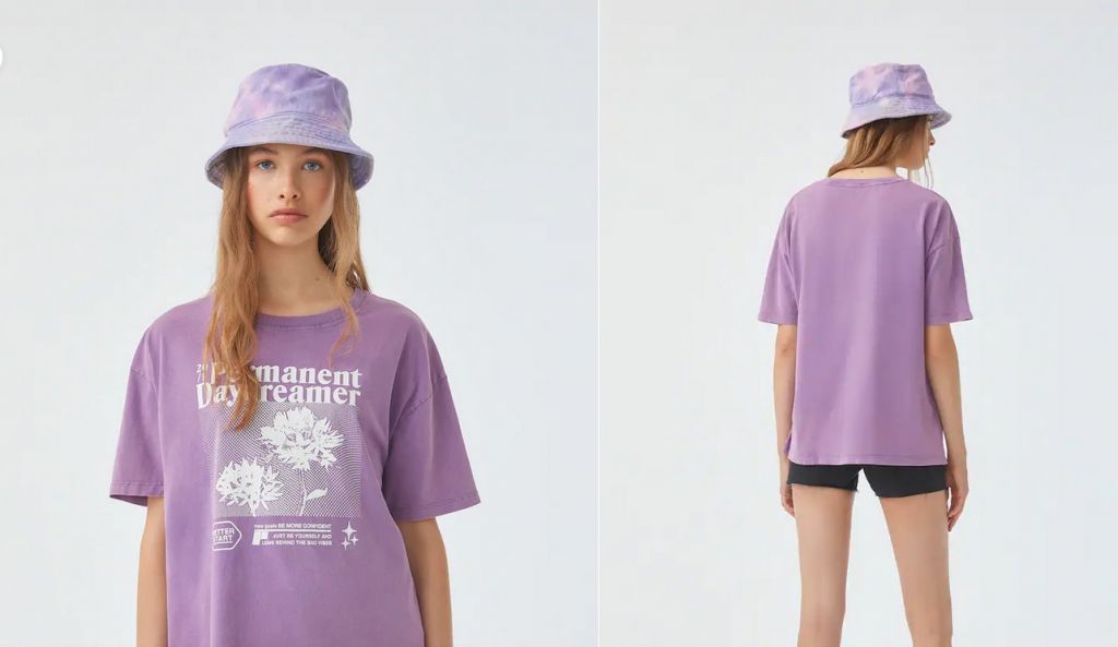 Por solo 12,99€ tendrás un chollazo para comprar esta camiseta de flores de Pull&Bear. Está disponible en varias tallas, y en esta tonalidad de color morado claro. Un color muy llamativo que resaltará mucho, y que dará mucho juego para crear contrastes con otros tonos más oscuros.