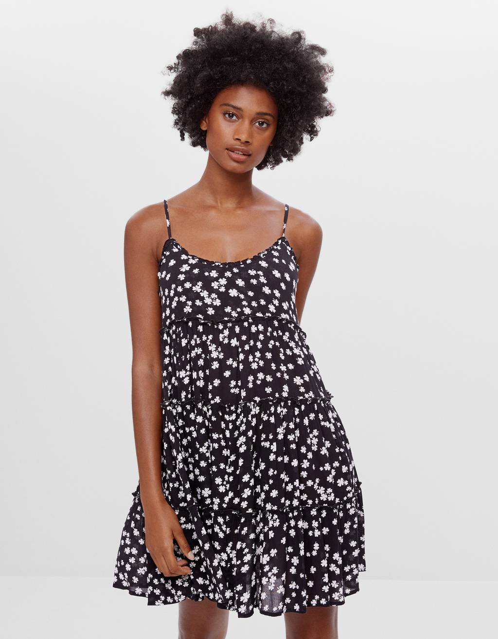Se trata de un diseño con estampado floral, de fondo negro y flores en color blanco. Tiene tirantes finos, escote en pico y detalle de volantes. El precio de la prenda es de solo 7,99 euros, y lo tienes disponible en verde y camel además de este negro. Te dejamos con el enlace donde podrás encontrarlo.