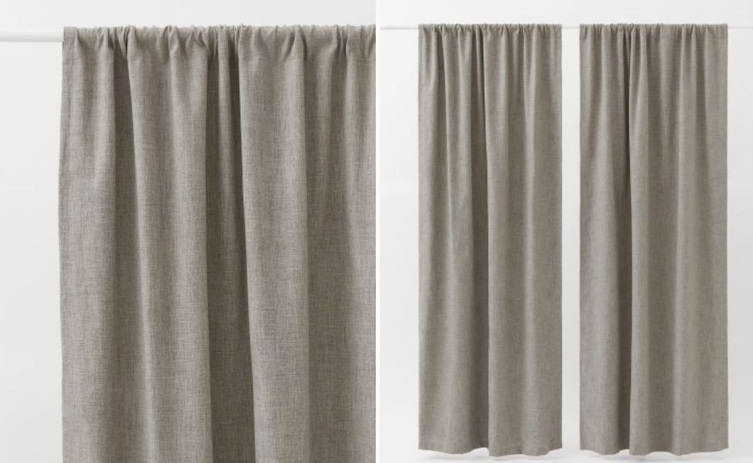 Son cortinas opacas con forro en la parte posterior, así reduces la cantidad de luz que entra en la estancia de la forma más sencilla. Están confeccionadas en poliéster tanto las propias cortinas como el forro. Aunque este mismo modelo está disponible en blanco natural, en esta ocasión hemos escogido el beige jaspeado por ser un tono muy neutro y muy sufrido.