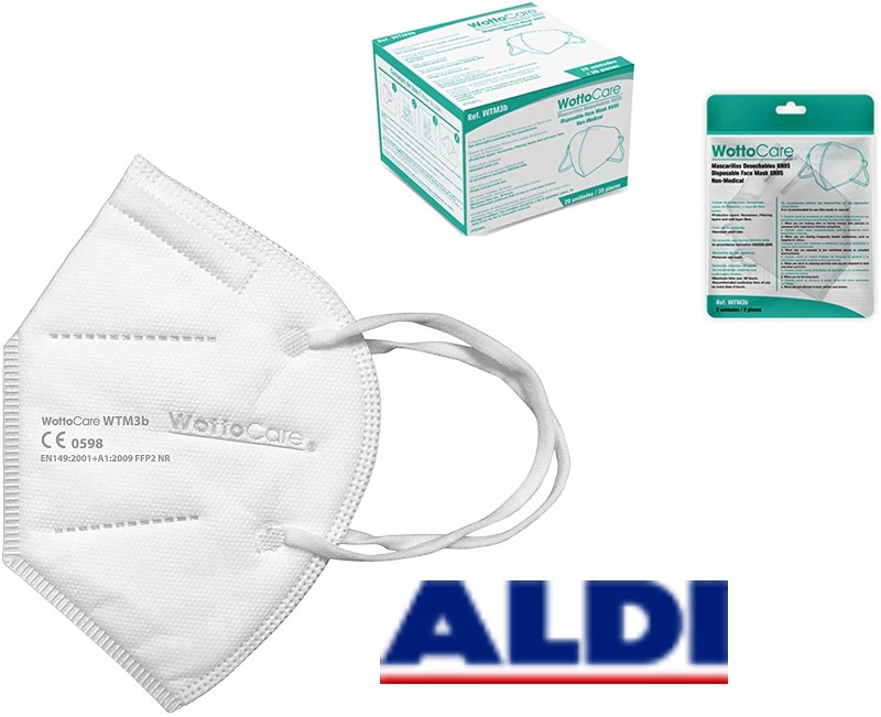 El supermercado low-cost Aldi también ha decidido incluir en su stock las mascarillas FFP2 y son muy similares a las de Carrefour, aunque un poco más caras. La unidad sale a 2 €, y se pueden adquirir en packs de 10 unidades por 19,99 € o bien en cajas de 3 por 5,99 €.