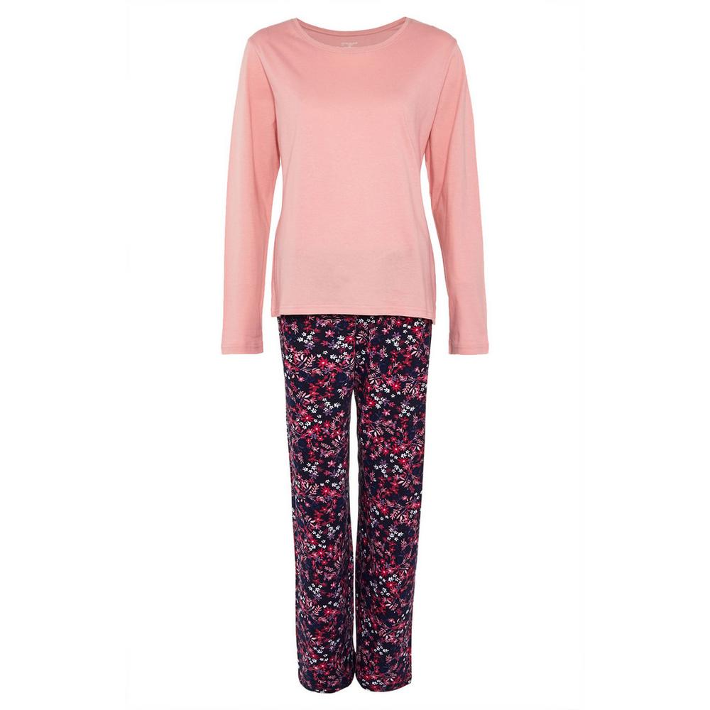 Este modelo es de lo más sencillo, aunque destaca por el estampado de sus pantalones. Una parte superior de cuello redondo, manga larga y color rosa liso, sin más detalles, y una parte inferior con estampado floral, también en tonos rosas.