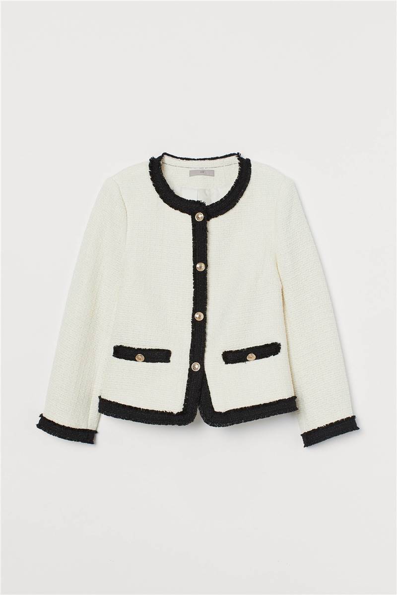 Una preciosa chaqueta que querrás tener es esta chaqueta en bouclé texturizado de mezcla de lana que tiene detalles a contraste de H&M, por menos de 50 euros.