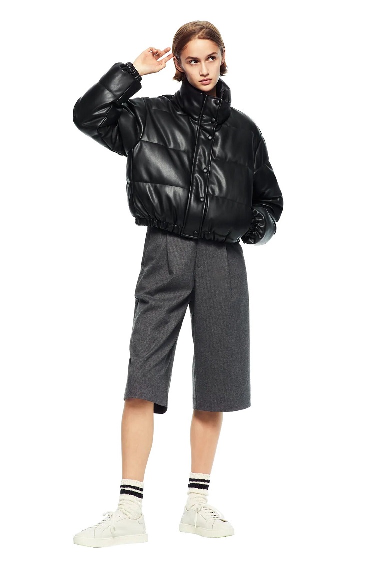 La siguiente prenda que tenemos es esta cazadora acolchada de color negro. Es una prenda hecha con 100% poliéster en el tejido base, 100% poliuretano en el recubrimiento, 100% poliéster en el forro y 100% poliéster en el relleno.