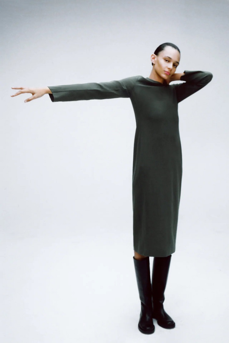 Lo siguiente es este vestido con lana edición limitada de color gris antracita. Este vestido pertenece a la colección Premium Wool Capsule Collection. Tiene vestido de cuello redondo, manga larga y cierre de espalda con cremallera.