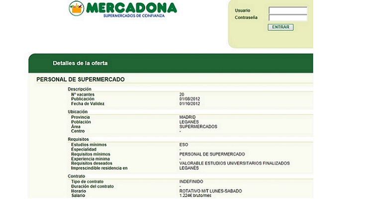 Para solicitar trabajo,es un poco confuso, pero se puede hacer a través de esta página web.Aquí, podrás ver todas las ofertas disponibles, y postular tu candidatura realizando un registro en la página web y adjuntar el currículum vitae. Si no encuentras el supermercado de tu localidad, es que en este momento, no hay vacantes. Puede resultar algo confuso, porque como hemos dicho muchas veces, la web de Mercadona es de una calidad pobre, sin embargo, al final con paciencia se puede echar el currículum.