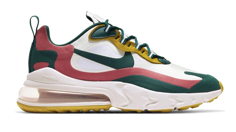 Ahora pasamos de Adidas a Nike, su máxima competencia, con estas zapatillas casuales de hombre Air Max 270 React de color blanco, verde, amarillo y rojo. Son una versión con el diseño basado en el panteón de estrellas Air Max, con colores modernos y un diseño espectacular.