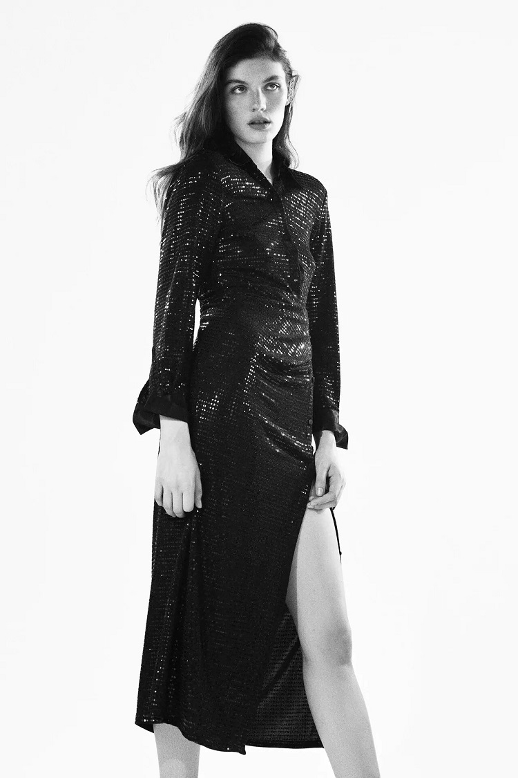 El siguiente producto de Zara es este vestido camisero brillos de color negro. Tiene cuello solapa, manga larga acabada en puño, acabados combinados a tono y detalle de pliegue en delantero. Asimismo, tiene aplicación de brillos y cierre frontal con botones forrados.