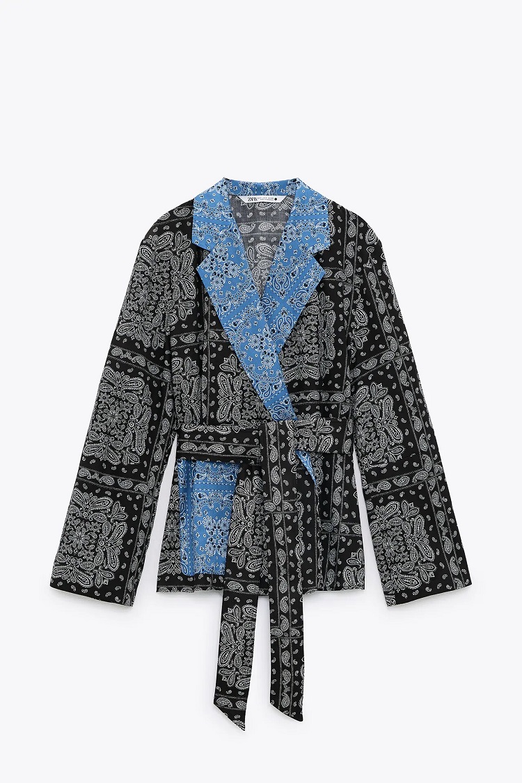 La siguiente prenda de Zara es una blusa cruzada estampada de color negro y azul con estampados. Tiene cuello solapa, escote cruzado con manga larga, cinturón lazada en mismo tejido y cierre cruzado con botones interiores.