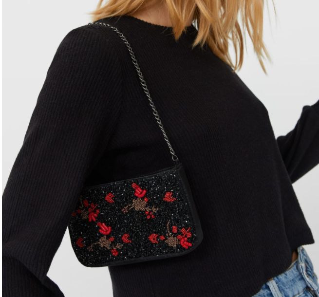 Stradivarius en su nueva colección de bolsos presenta esta mini bandolera, para la mujer práctica que gusta de llevar lo indispensable. Con un diseño cómodo y atractivo, la firma presenta un mini bolso con dos caras: una creada con estampados, realizados a base de pequeños cristales de colores, que forman figuras sobre cristales irregulares más grandes de color negro; la otra cara exterior es lisa en su totalidad, de poliéster grueso.