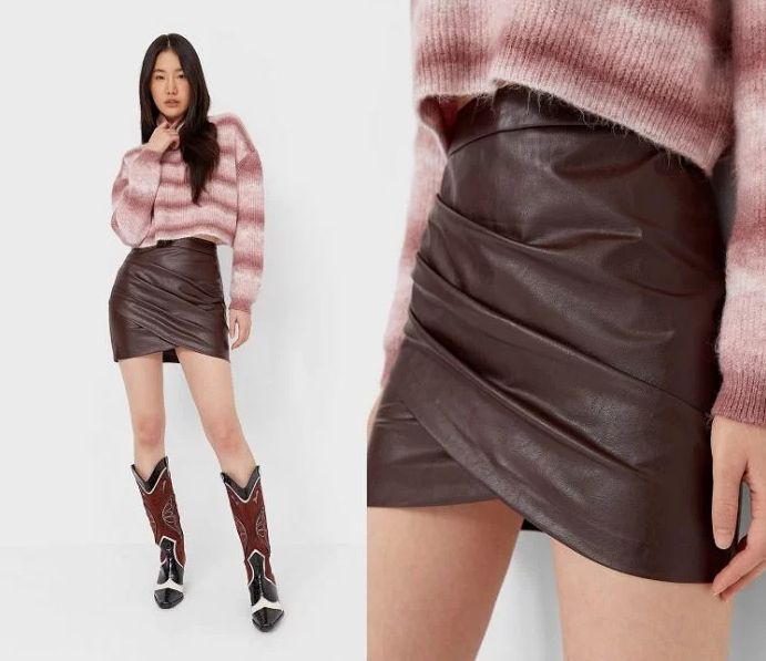 Las minifaldas son perfectas para cualquier estación del año aunque quizá la primavera sea la mejor porque puedes combinarlas con medias o con distintos tipos de calzado. Así que es un buen momento para hacerse con una como esta tan original de Stradivarius que combina el efecto piel con un diseño que simula el cruce de un pareo. Dos detalles que hacen que esta pieza sea diferente y única, y que puedes combinar con una sencilla camiseta, y conseguirás un resultado de lo más estiloso. El precio es de 9,99 €.