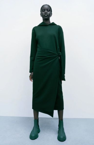 Nos recuerda un poco al hábito de un monje, porque incluso tiene una capucha caída que, por cierto, te vendrá muy bien para esos días de frío helador. Con un bajo asimétrico que te permite jugar con los volúmenes y un original detalle de nudo en el costado. El resultado es un vestido perfecto para ir a trabajar, para salir a tomar algo o para cualquier otra situación.