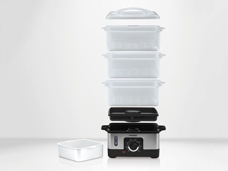 Viene con 3 vaporeras sin BPA que están pensadas para pescado, carne, verdura o incluso para hacer huevos cocidos. Tiene temporizador de hasta 75 minutos, depósito de 1,2 litros con indicador de nivel de agua, pudiéndose añadir agua mientras está cociendo. También tiene apagado automático y los accesorios se pueden apilar para ocupar menos sitio. El precio es de 22,99 euros.