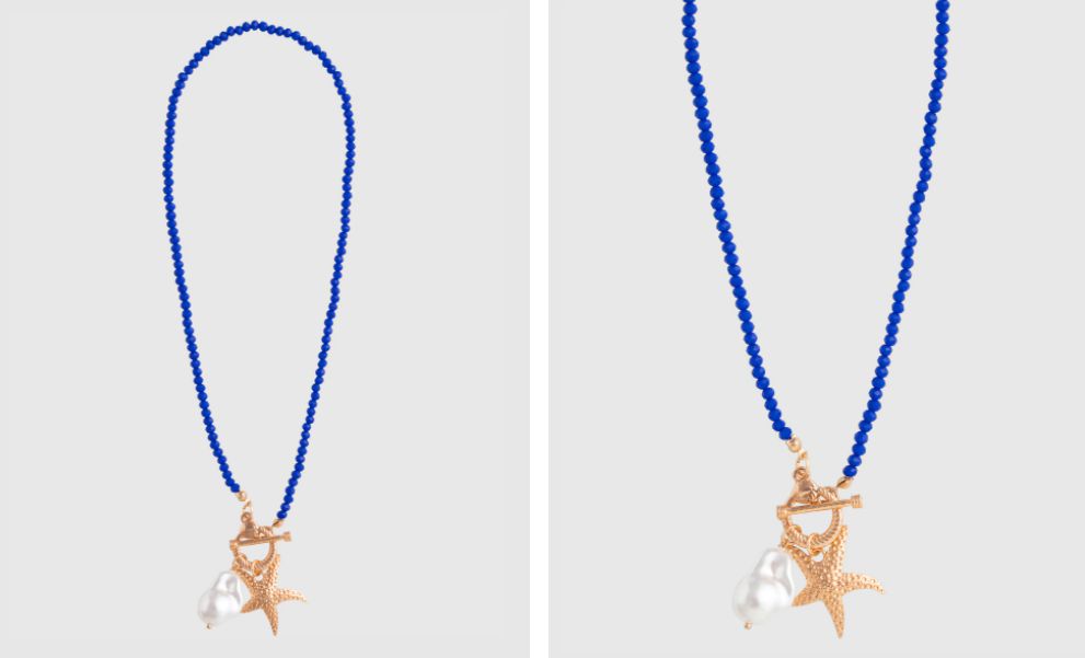Las ofertas límite de El Corte Inglés, que están disponibles hasta el 17 de febrero, nos abre la opción de comprar joyas y bisutería tan interesante y barata como este collar de la casa con minicuentas azules. De inspiración claramente marinera, cuenta con cierre en la parte frontal del collar, lo que no es muy común en este tipo de bisutería. Además, combina las perlas con un ancla que hace de nexo entre ellas y la estrella de mar, metálica con baño en oro, y una perla blanca. Todos y cada uno de los elementos de este artículo es plano, para que asiente mejor en el cuello.