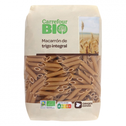 El primer producto ecológico que veremos es este paquete de macarrones de trigo integral BIO. Estos macarrones están hechos simplemente con un 100% de sémola integral de trigo duro, completamente procedente de la agricultura ecológica. No tiene azúcares añadidos, solamente los que están naturalmente presentes.