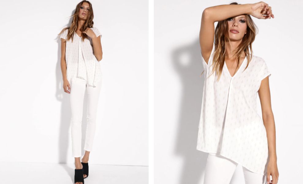Si hay algo que distingue a las blusas de las camisas es lo atrevido del patronaje de las primeras. Para muestra, un botón. O más bien ninguno, pues esta es la propuesta en blusas de la marca Elogy que se vende en El Corte Inglés. Se trata de una pieza de manga corta con detalle metalizado muy original. De corte oversize, ni siquiera tiene pinzas en la parte trasera. Además de su color blanco roto que contrasta de forma elegante con el estampado asimétrico propuesto, nos encanta por ese original frontal con cierre completo cosido en la parte superior del escote en pico que después vuela libre hasta generar una sensación de asimetría muy interesante. Confeccionada completamente en poliéster, está también disponible en un tono pistacho más atrevido que el clásico blanco. Llévatela por tan sólo 5,99 euros.