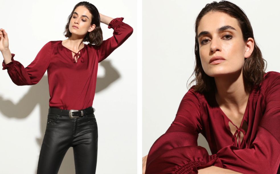 Aquí vemos el ejemplo perfecto de efecto oversize, pero que sí apuesta por las pinzas en la parte trasera para favorecer la caída de la prenda. Además de tener un color rojo burdeos precioso que te enamorará nada más probártela, cuenta con unos originales puños fruncidos. También puedes comprarla en un tono pastel. Aunque hace efecto satén, es 100% poliéster. Aprovecha para conseguir esta prenda con un 70% de descuento en El Corte Inglés antes de que se agote el tiempo.