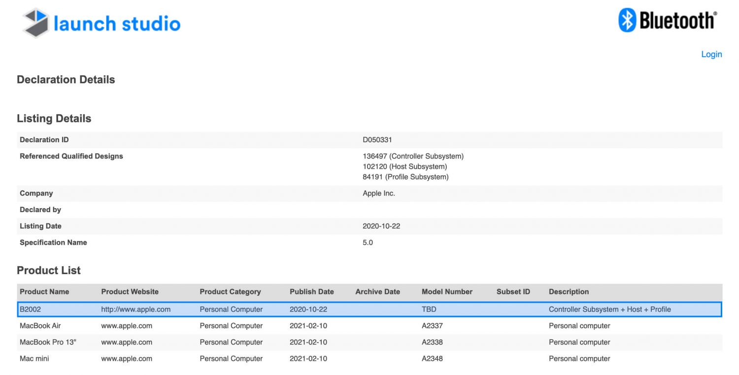 A finales del mes de octubre de 2020, Apple registró un producto desconocido en la base de datos de tecnologías Bluetooth. El nombre de la patente que se usa como referencia es B2002, y estaba dentro de la categoría Personal Computer, es decir, que podría ser algún modelo de ordenador personal. En cuanto a la fecha, aparece marcado como TBD (To Be Determinated), es decir, que estaba aún por confirmar. Por tanto, la incertidumbre sobre este misterioso producto son totales, más cuando se habla de la firma de Cupertino, que tiene una inmensa legión de fanáticos en todo el mundo y se analiza con lupa cada movimiento.