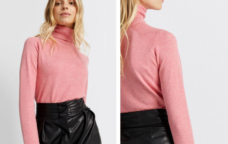 Estrenamos este repaso por los jerséis de Sfera más baratos que se pueden comprar en El Corte Inglés con un modelo muy clásico, y, al mismo tiempo, versátil. Se trata de un jersey de materiales sintéticos (viscosa y poliamida), en un único tono, sin nada de estampados, que presenta cuello alto tipo canalé. A diferencia de otros modelos de la marca, aquí es un cuello extra largo, que permite una vuelta completa cubriendo todo el cuello.