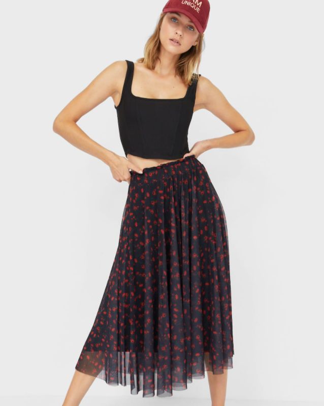 Uno de los tejidos que esta temporada de primavera-verano 2021 está de moda son los tul o el efecto tul. Lo vaporoso se lleva, quizás porque necesitamos esas sensación de libertad que no hemos sentido en estos últimos doce meses. Stradivarius apuesta por varios modelos de faldas tanto en versión midi francesa como en cortas, y también para vestidos y camisas. Este modelo en concreto nos ha enamorado por su caída efecto plisada, con reminiscencias boho-ibicenco pero con un toque de estilo diferente. La cintura, también de talle alto, como la mayoría de la marca, lleva gomas para que sea mucho más cómoda y fácil de poner. Para contrarrestar las transparencias del tul incluye un forro interior que no ahoga ni aprieta. Está disponible en camel oscuro además de este precioso rojo oscuro.