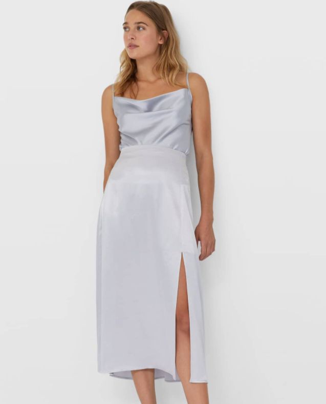 Por último, ponemos el foco en uno de esos tejidos que son minoritarios, pero que también están siempre presentes en las diversas colecciones de moda de las marcas. Stradivarius apuesta por el satén también en sus faldas, como este modelo también de corte midi, con apertura lateral hasta algo menos de medio muslo, en un precioso color gris perla. Su caída no hay más que verla en la modelo: perfecta, sutil, elegante y favorecedora. De nuevo, nos encontramos con faldas de cintura de tiro alto, que además incluyen el punto de lo elástico para que resulten más cómodas pero sin comprometer la estética. Busca tu talla entre las disponibles y marca tu estilo por tan solo 5,99 euros.