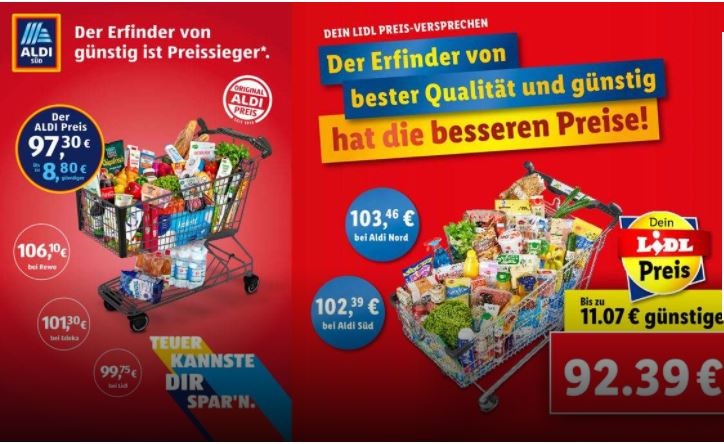 Dicha cesta estaba compuesta por 70 artículos. Lidl decía que la suya era 11 euros más barata. Aldi, por su parte, afirmaba que era nueve euros más barato que el resto de competidores. Además de la rebaja del IVA, el motivo que les llevó a la publicidad comparativa fue que, durante el mes de abril, Edeka y Rewe había aumentado sus ventas un 26%. Aldi y Lidl sólo lo habían hecho un 20%.