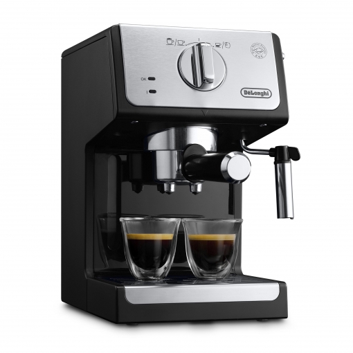 Seguimos con esta cafetera expreso manual Delonghi PUMP EC31.21 de Carrefour. Tiene función para hacer cappuccino, mezclando vapor, leche y aire para conseguir la mezcla perfecta. Cuenta con 15 bares de presión, permite café en polvo y permite preparar dos cafés al mismo tiempo.