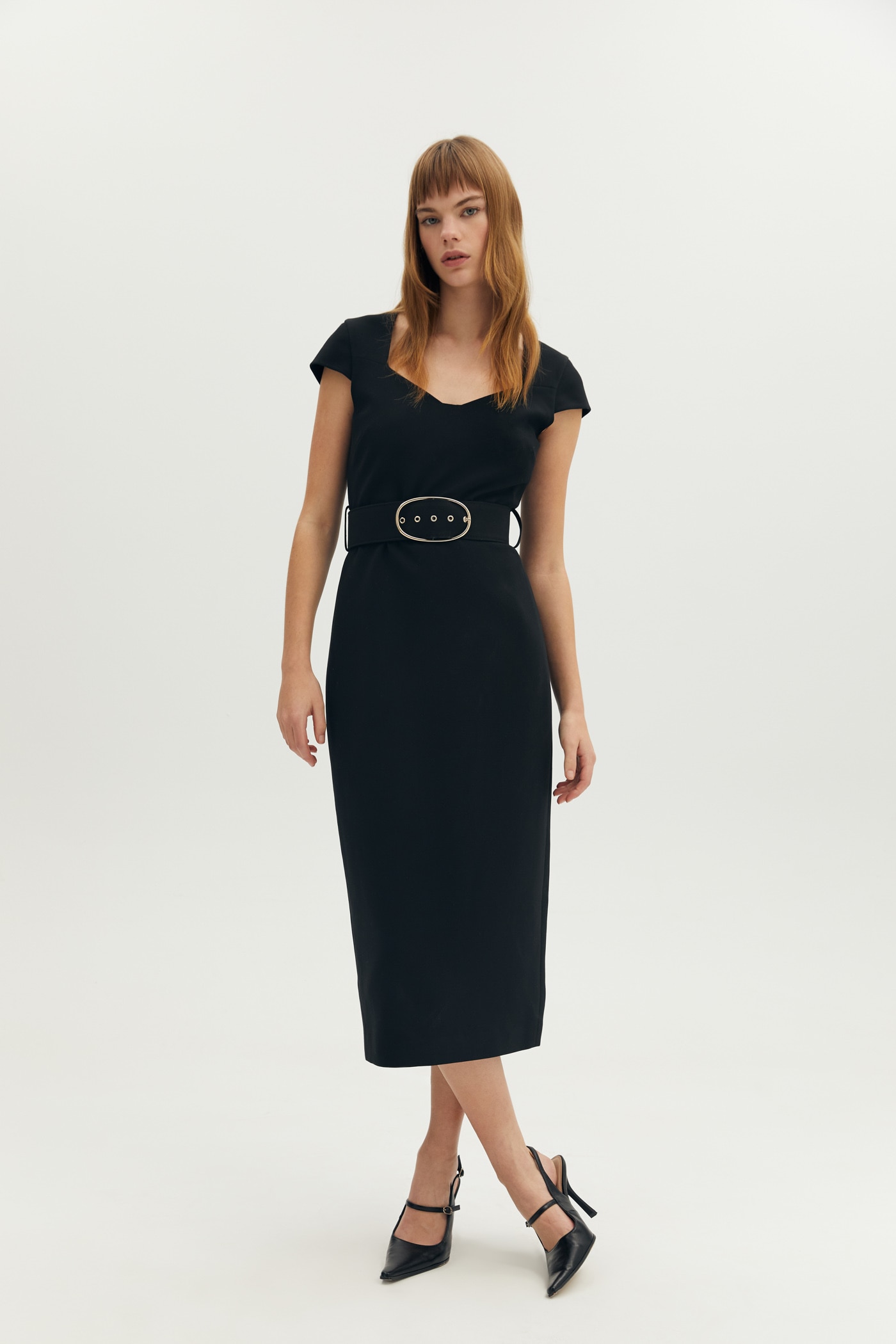 Se trata de un vestido en color negro, largo y escote de pico. Tiene manga corta y cinturón bajo el pecho con hebilla. Como detalle, tiene apertura en el bajo de la parte trasera. El precio de la prenda es de 49,99 euros, y este es el enlace en el que puedes encontrarlo.