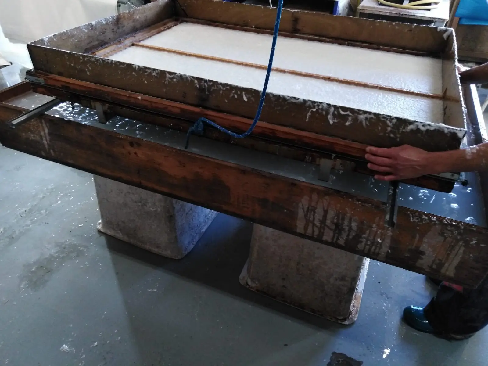 Una vez obtenidas las fibras secas y limpias se les hace el mismo tratamiento que a su papel artesanal. Esta fibra pasa al molino, mediante la piedra holandesa. Es decir, por un lado muele y por el otro corta la fibra. Esta pulpa se trabaja después con el tamiz para poder hacer después el papel. Desde que recoge la mierda hasta que puede entregar el producto acabado pasan de dos a tres días.