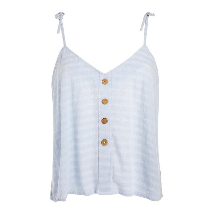 Se trata de una camiseta con estampado de rayas en color azul. Tiene escote de pico con detalle de botones de madera, además de tirantes con lazada.