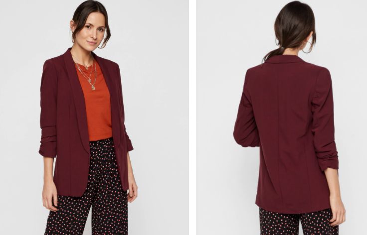 ¿Quieres algo de color para tu armario? La marca de moda para mujer Pieces nos presenta una blazer de mujer con manga francesa de 3/4 de lo más elegante. Puedes elegir, además del granate de la imagen, entre el marrón claro, el marrón más oscuro o el clásico negro. Cuenta con pinza cerrada tanto delante como detrás, y fruncido en las mangas. Es completamente abierta y carece de bolsillos. Puedes combinarla fácilmente con unos jeggins, unos jeans o una falda. Incluso con vestidos estampados te sentará a las mil maravillas. No tiene descuento, pero tiene un precio más que justo: 39,99 euros.