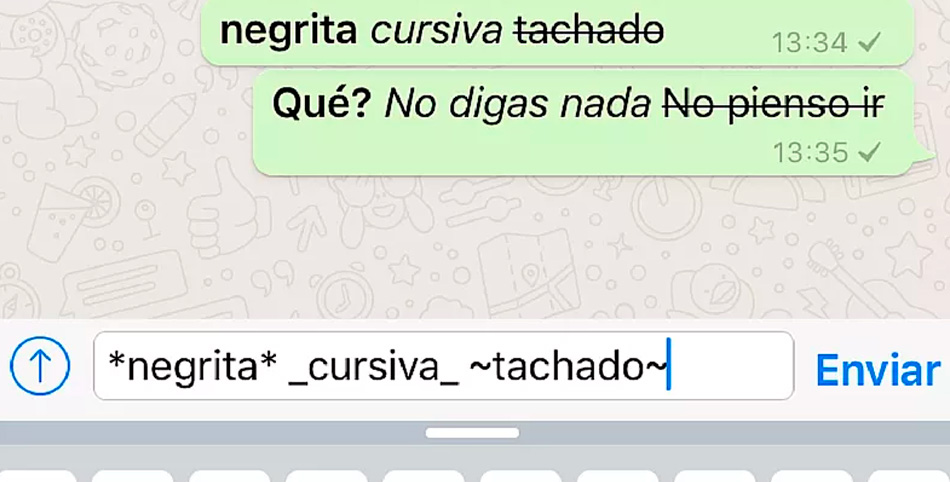 Si deseamos enviar una cursiva se coloca _ al principio y final de las palabras, y para tachar se le añade ~.