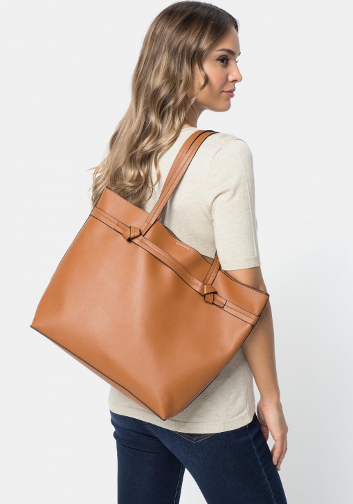 Está disponible en color camello y negro, con un diseño elegante y minimalista capaz de combinar con multitud de estilos. Presenta dos asas cortas para llevar en la mano o para colgar en el hombro. También se incluyen detalles de nudos como adornos para darle un toque más distinguido.