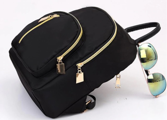 Con un acabado muy suave, gracias al tejido por el que está compuesta, nos encontramos con esta otra idea para poder llevar todo lo necesario durante el día. Se trata de una mochila combinada en color básico negro y dorado.