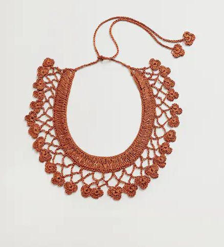El crochet es una técnica de ganchillo con la que se pueden hacer todo tipo de creaciones, e incorporada a la moda, aporta una nota hippy y bohemia a cualquier look, muy especial. Esta temporada en Mango vamos a poder encontrar varios complementos tipo joya, elaborados en este material, con diseños de lo más originales y únicos. Por ejemplo este fantástico collar de abalorios en color tabaco, maravilloso para personalizar cualquier estilismo. Cierra con un nudo y como es un abalorio muy ligero, es todo un placer llevarlo puesto. Puede ser tuyo por solo 15,99€.