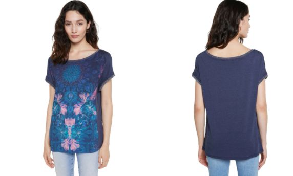 Seguimos con los estampados en camisetas de la nueva colección de primavera de El Corte Inglés. Esta vez de la mano de Desigual, lo que implica motivos más boho incluyendo mandalas adornadas con tachuelas. Un toque muy de la casa. Aunque en la imagen se aprecia muy levemente, la marca ha utilizado hilo de lúrex en el cuello y los puños, por lo que parecen brillar. De hecho, esta es una de las camisetas que apuesta más por el poliéster y la viscosa que por los algodones. Hay dos opciones: esta con base azul marino, y una sobre blanco con estampado en rosa palo. Cuesta 39,95 euros.