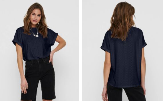 Otra de las tendencias que se llevarán esta primavera-verano 2021 son las mangas anchas, también en las camisetas cortas, como vemos en este modelo de la marca Only que se vende en El Corte Inglés. Aunque a simple vista puede parece que es una prenda monocromática, sobre todo en los tonos blanco y marino, se trata de una prenda en poliéster calada, con formas tipo colmena verticales que da un efecto muy singular y original. Sin ser un diseño atrevido es diferente, menos soso. Además de los dos tonos mencionados, también hay en rosa. Consíguelas por sólo 19,99 euros cada una.