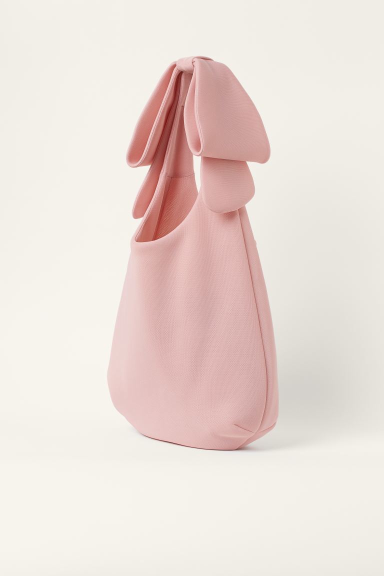 Es un bolso de tamaño grande y con gran capacidad. Confeccionado con malla de neopreno de doble capa y un lazo oversize en la correa. No tiene cierre, pero sí tiene un compartimento interior independiente. Su color rosa lo convierte en el complemento perfecto para lucir tanto en primavera como en verano.