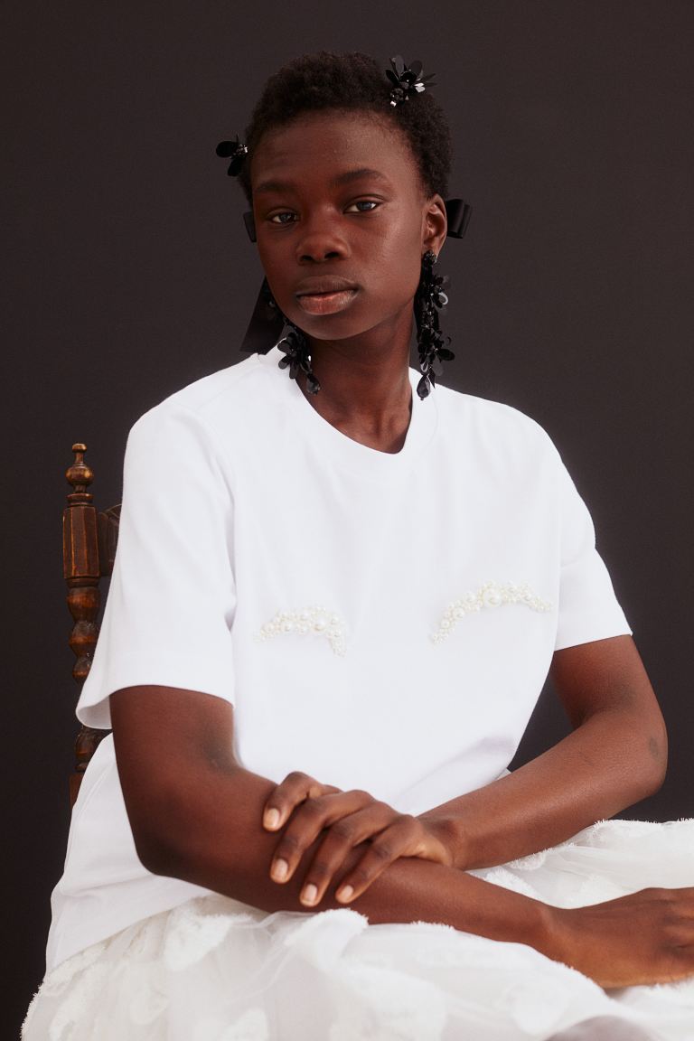 Como has podido comprobar, esta colección está llena de apliques de perlas. Por eso, estas no podían faltar en las camisetas de Simone Rocha. Una prenda sencilla que pasa a convertirse en algo único gracias a las perlas sintéticas que simulan unas cejas. Confeccionada en algodón de la máxima calidad, va perfecta para combinarla con tus vaqueros favoritos.