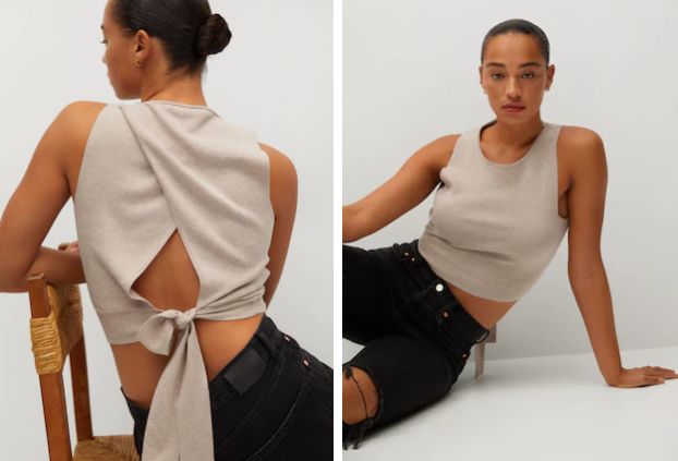 ¿Buscas un top barato y que sea original? ¿Estás cansada de los mismos modelos siempre? Mira la nueva colección de Mango y descubre joyas como este top de espalda cruzada, corto y con una caída en el cuerpo sencillamente perfecta. Este diseño crop sin mangas, cuenta con un cuello redondo cerrado que hace que el frontal estilice aún más el busto de la mujer, tenga más o menos. Está confeccionada en tejido de punto fino de algodón 100%, por lo que podrás lavarla sin preocupación en la lavadora.