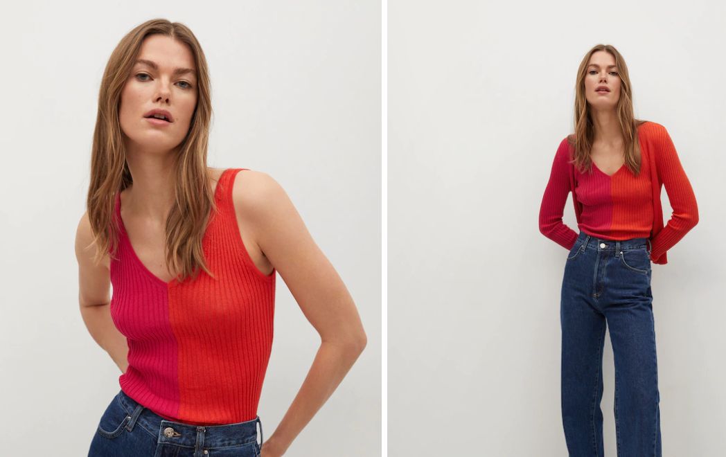 De entre los tops de Mango, además del ya visto al inicio, nos ha llamado la atención este diseño en punto canalé con ese punto original de tener dos colores, mitad y mitad. Aunque esto solo ocurra con el rosa, ya que le modelo en blanco roto es monocolor. Presenta un diseño en cuello pico tanto en la parte delantera como en la trasera, donde deja la espalda bastante abierta. Se trata de uno de los escasos modelos de camisetas para el buen tiempo de Mango de diseño entallado. Los tirantes son anchos y asientan muy bien en el hombro, por lo que resulta una prenda cómoda. Su precio es de 25,99 euros, y cuenta con el hándicap de que solo se puede comprar online.