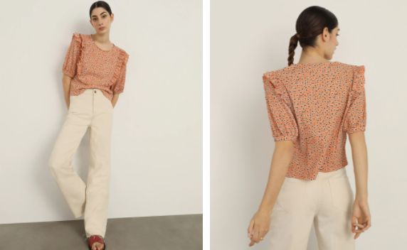 También cuenta con una parte de fruncido en las mangas, que son cortas. El cuello es redondo, ni muy abierto ni muy cerrado y el cuerpo, completamente recto. Está disponible en dos tonos: el pastel de la imagen y en blanco, por el módico precio de 17,99 euros. ¡Una ganga!
